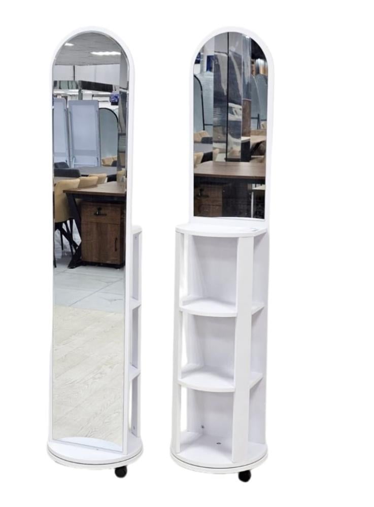 مرايا طوليه متحركة مع قاعدة دواره و ارفف خشبيه لعرض أدوات الزينة و المقتنيات والكتب لإضفاء لمسة جمال لغرفة النوم والمكتب والمكان الذي توضع فيه مراية الارفف توفر لك منظر جمالي و مساحة إضافية في الغرفة , مرايا الارفف مصنوعه من الزجاج و هيكل من الخشب عالي الدقة وقاعدة خشب دواره ومتحركة مما يسهل نقلها من مكان لأخر , مرايا الارفف يمكنك تنظيفها بمسحة رقيقة .