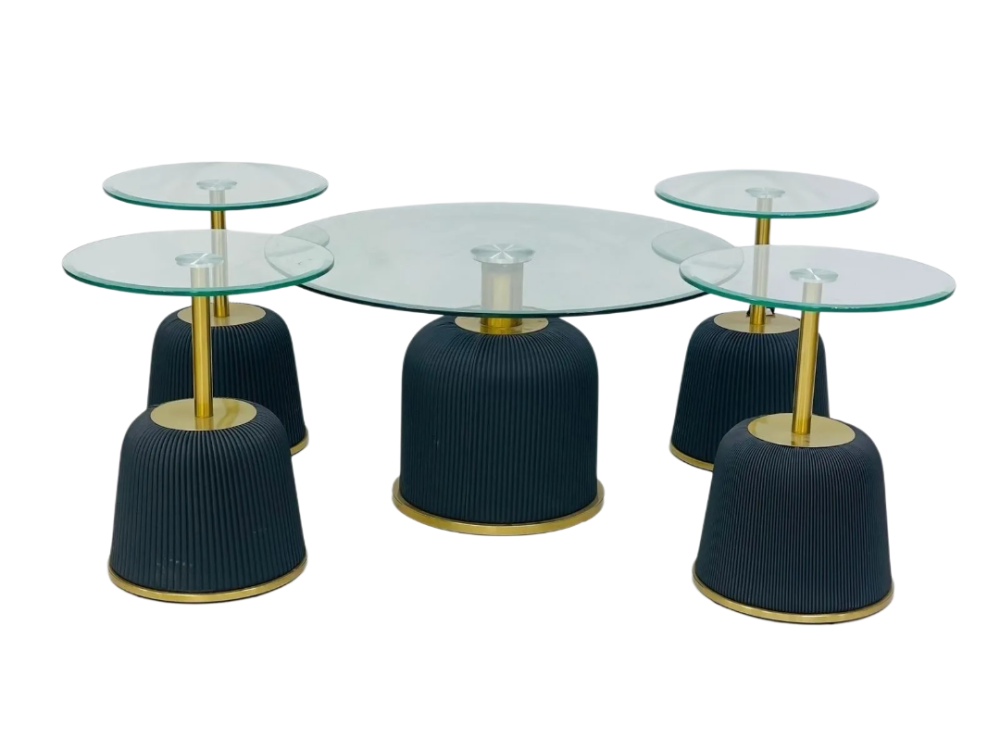 طقم الطاولات الضيافة الذي يتكون من جلد رصاصي غامق وزجاج شفاف يعتبر خياراً ممتازاً لإضافة لمسة من الفخامة والأناقة إلى أي غرفة معيشة أو صالون