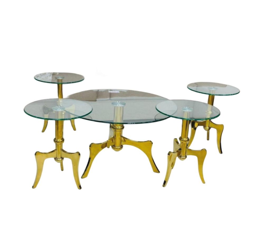 استمتع بجمال التفاصيل مع طقم طاولات زجاجية بقاعدة ذهبية أنيقة. يتميز هذا الطقم بتصميم راقٍ يدمج بين الفخامة والعملية، ويتكون من خمس طاولات: طاولة قهوة دائرية وأربع طاولات جانبية بارتفاعات متناسقة. سطح الطاولات مصنوع من الزجاج الشفاف المقوى ليبرز جمال القاعدة الذهبية المصقولة والتي تضيف لمسة من الرقي والفخامة لأي غرفة معيشة.