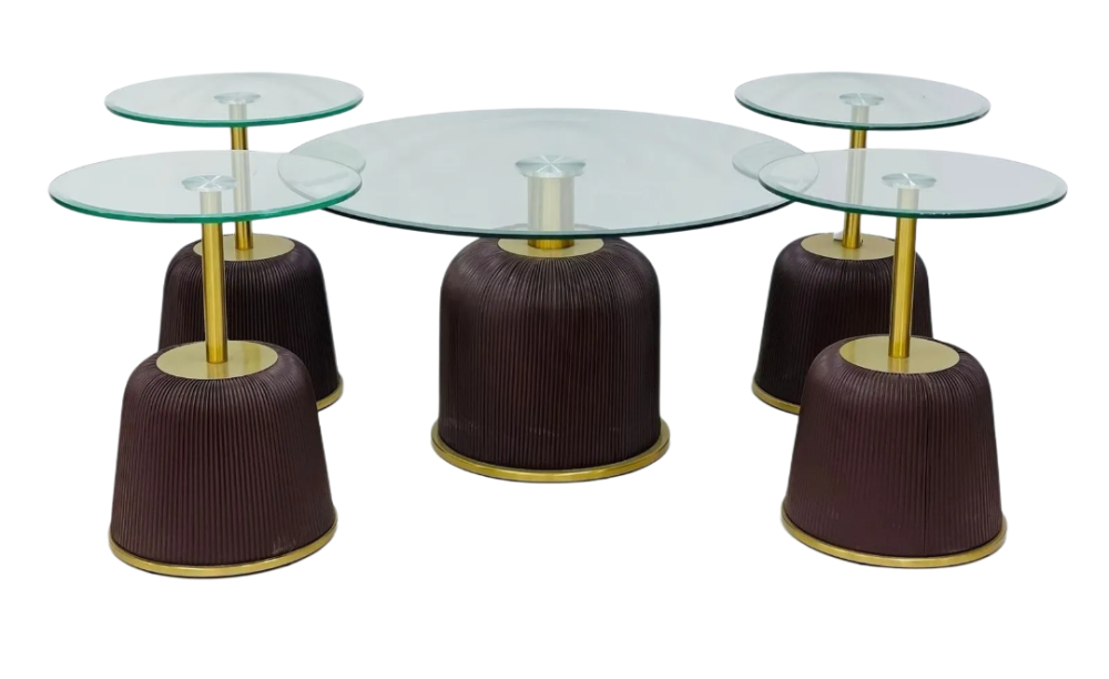 طقم الطاولات الضيافة الذي يتكون من جلد بني وزجاج شفاف يعتبر خياراً ممتازاً لإضافة لمسة من الفخامة والأناقة إلى أي غرفة معيشة أو صالون