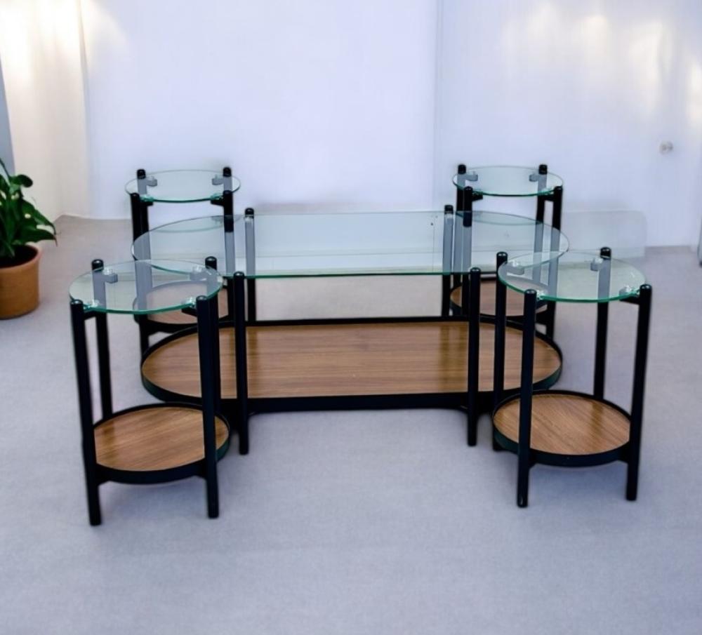 طقم طاولات خدمةدائري 4+1 زجاج وخشب لون بني فاتح من كاما