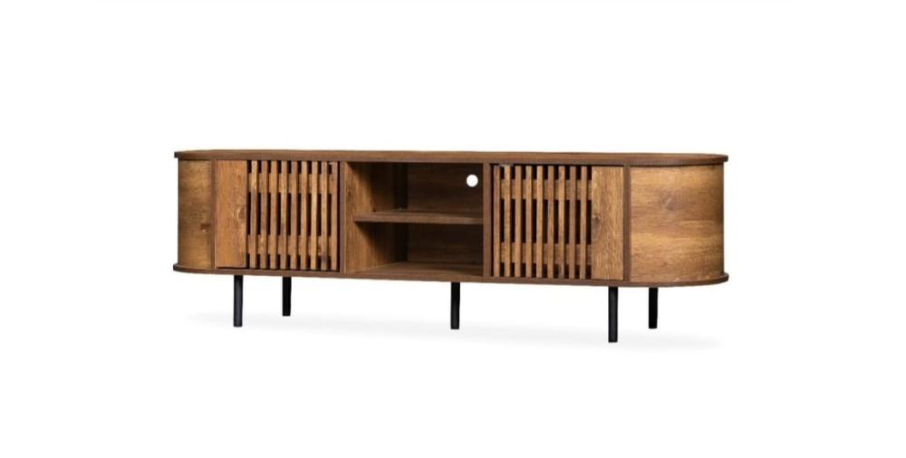 • طاولة بلازما مميزة بتصميم بسيط وانيق يضفي لمسة من الرقي للديكور المحيط، مصنوعة من أجود المواد بلون بني ومزودة بخزانتين جانبيتين ورفوف في المنتصف بالإضافة لفتحة دائرية تفيد في تمير الأسلاك بأسلوب مخفي وانيق، لتشكل إضافة مميزة لديكور غرفة المعيشة