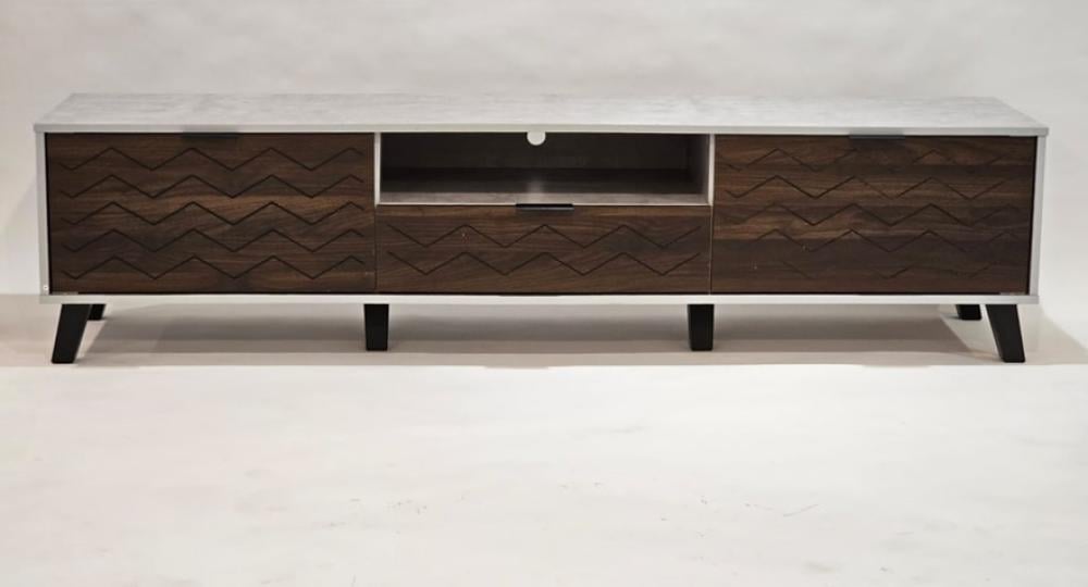 طاولة تلفزيون مصنوعة من أجود المواد المتينة والمقاومة للخدش بتصميم مميز مزينة بتفاصيل ناعمة وانيقة تضيق لمسة من الفخامة للتصميم، هذه الطاولة مزودة بأدراج ورفوف لاستخدامها في حفظ أجهزة التحكم والمجلات، كما أنها متوفرة بعدة ألوان مميزة وأنيقة