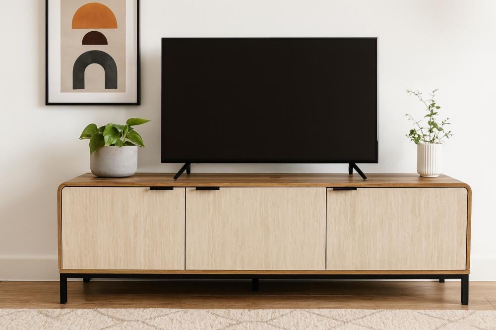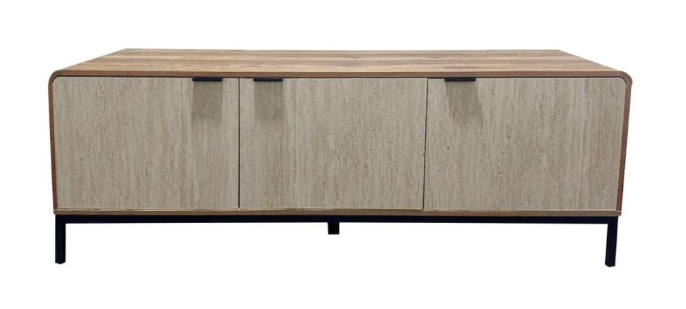 طاولة تلفزيون بتصميم عصري تجمع بين العملية والأناقة، مصنوعة من خامات خشبية متينة تمنح ثباتًا وقوة استخدام يومي. تتميز بثلاثة أبواب تخزين توفر مساحة واسعة لتنظيم الأجهزة والإكسسوارات بسهولة، مع سطح علوي مناسب لوضع التلفاز أو القطع الديكورية. أرجل معدنية مرتفعة تمنح الطاولة ثباتًا إضافيًا ولمسة مودرن تناسب معظم أنماط الديكور. تعتبر خيارًا مثاليًا لغرفة المعيشة بفضل مظهرها البسيط وقدرتها على إضفاء مظهر مرتب وأنيق للمساحة. تصميمها العملي يساعد على إخفاء الفوضى وتخزين كل ما تحتاجه في مكان واحد، مما يجعلها قطعة أساسية في أي منزل يبحث عن الأناقة والتنظيم.