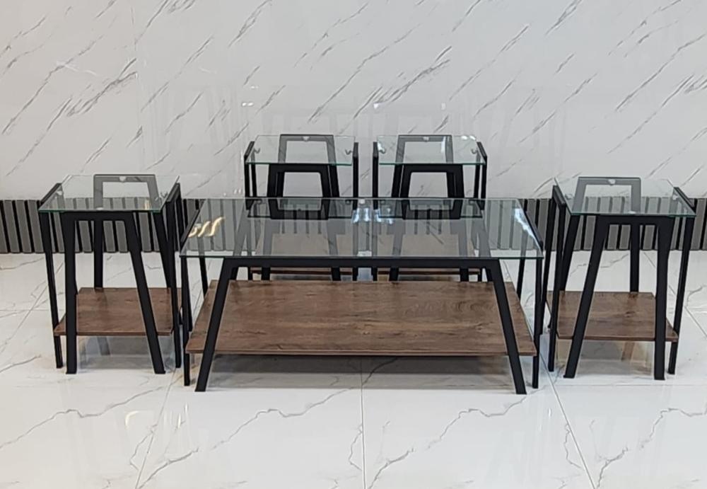 طقم طاولات خدمة مكون من طاولة وسط كبيرة بالاضافة الي عدد 4 طاولات خدمة صغيرة مصنوع من سطح زجاجي مثقول قوي مع رف سفلي من خشب MDF وقواعد معدنية ذات طلاء بوية ناري .