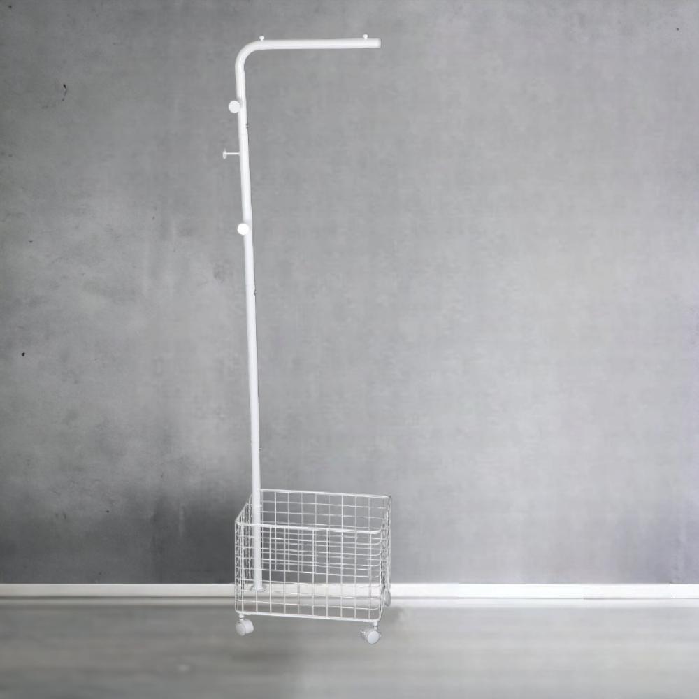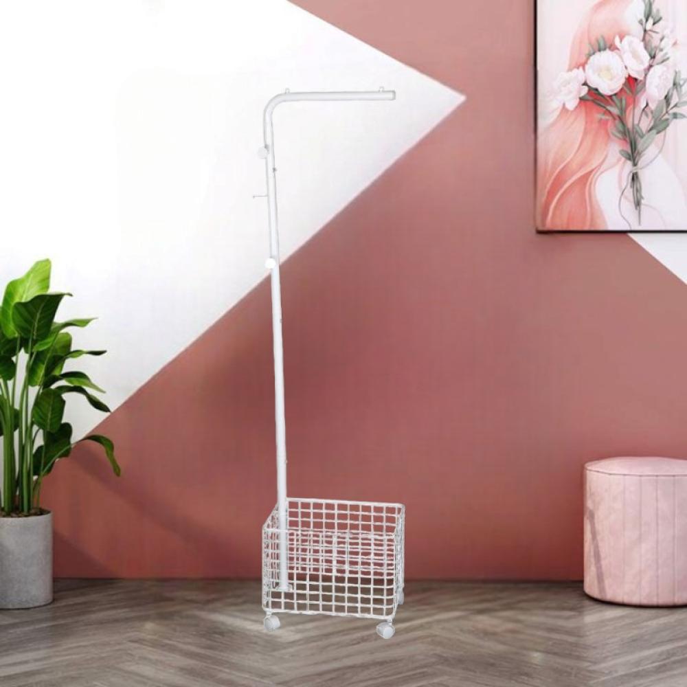 Black iron hanger with shelf and wheels for easy movement Specifications: